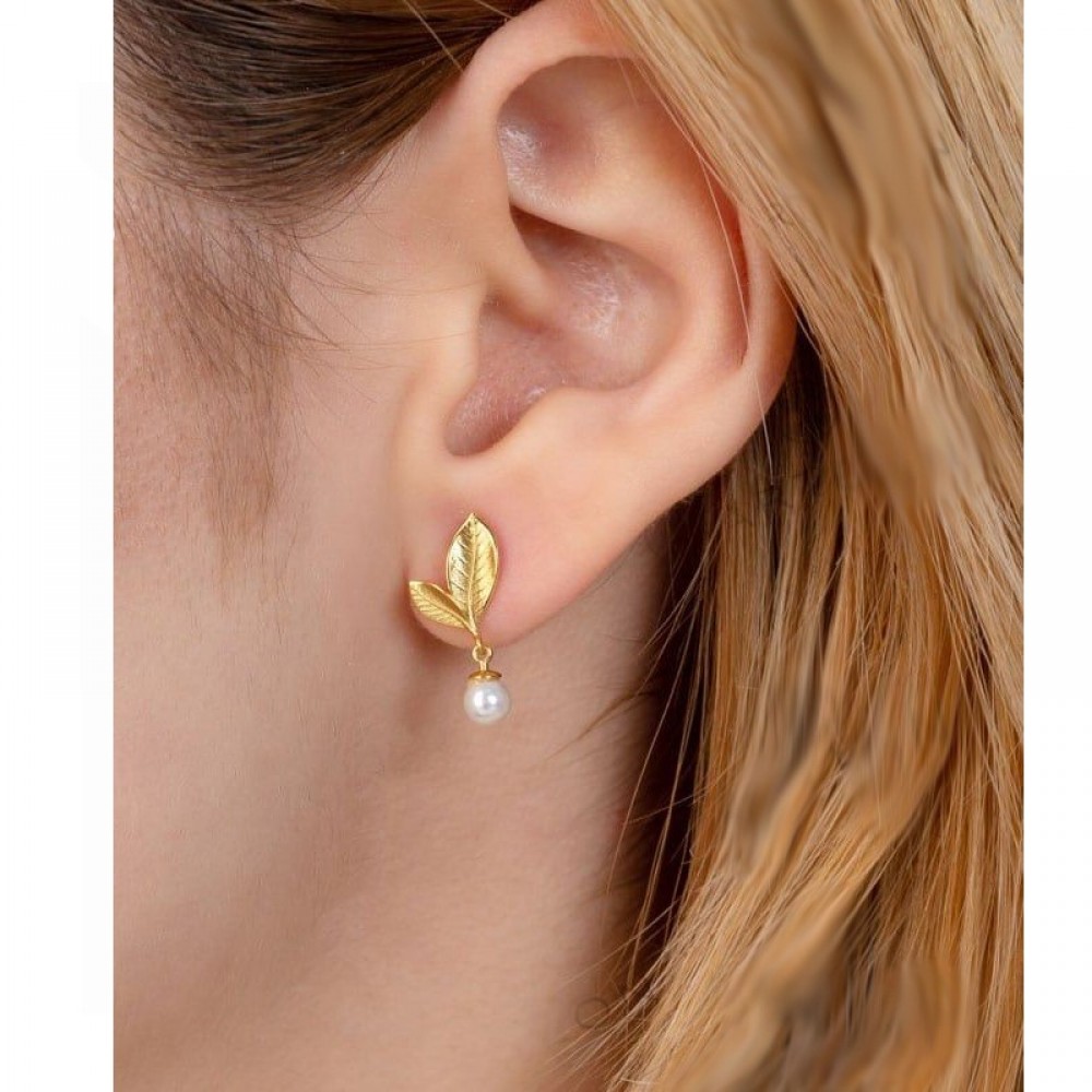 Ασημένια επίχρυσα κουμπωτά σκουλαρίκια με φύλλο και κρεμαστή πέρλα