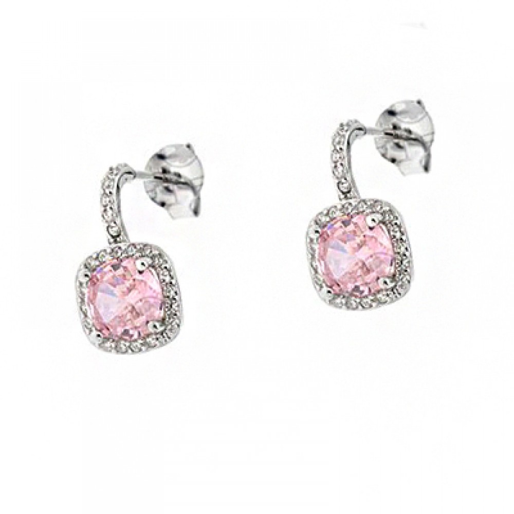 Ασημένια κουμπωτά σκουλαρίκια τετράγωνη ροζέτα με ροζ πέτρα