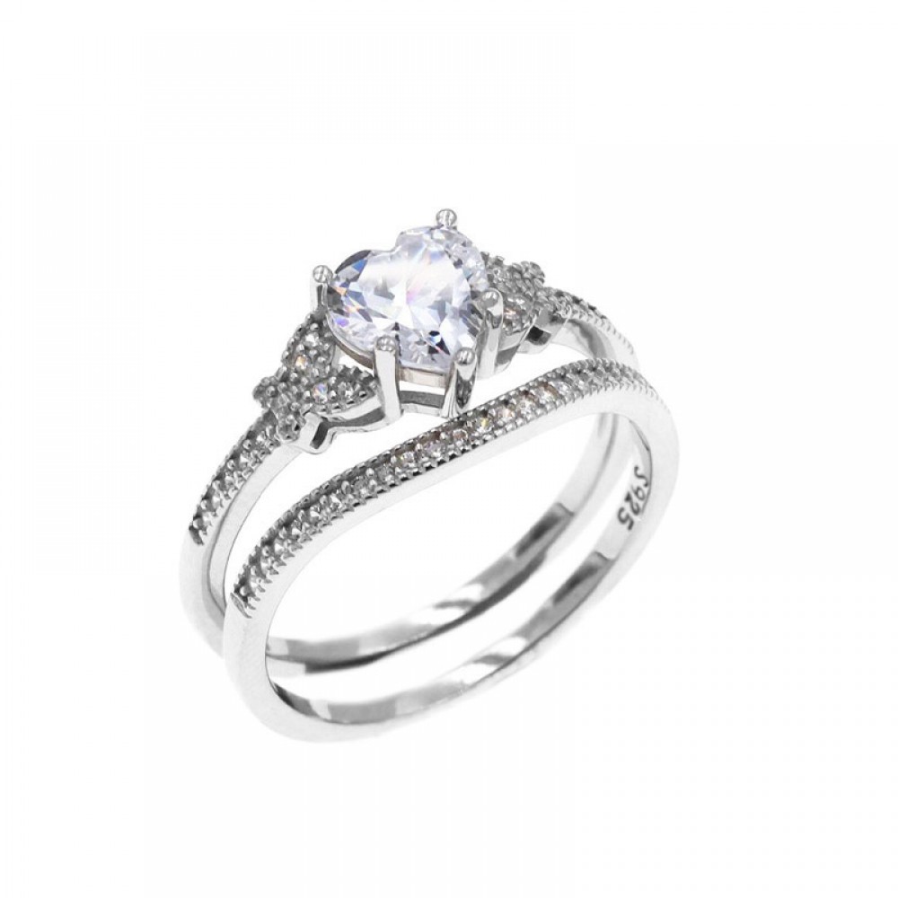 Ασημένιο διπλό δαχτυλίδι με μονόπετρο-καρδιά και βεράκι