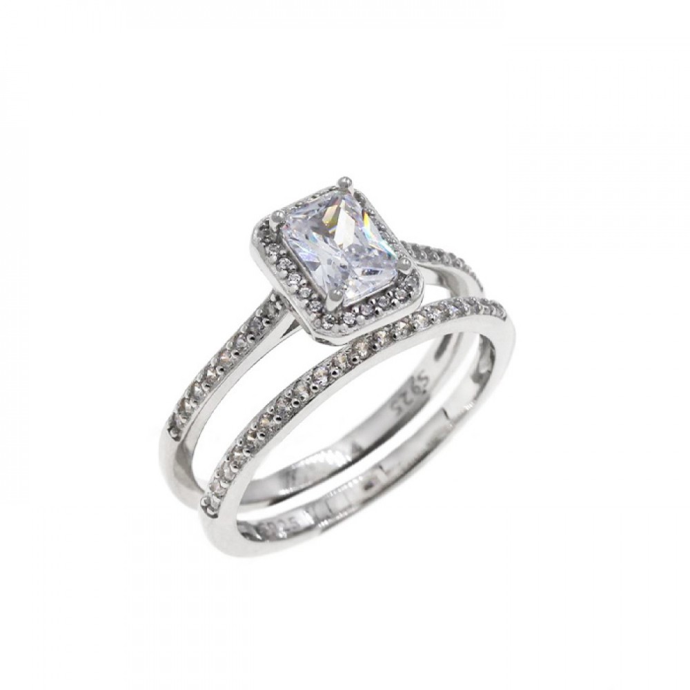Ασημένιο διπλό δαχτυλίδι (μονόπετρο - μισόβερο) με λευκές πέτρες ζιργκόν