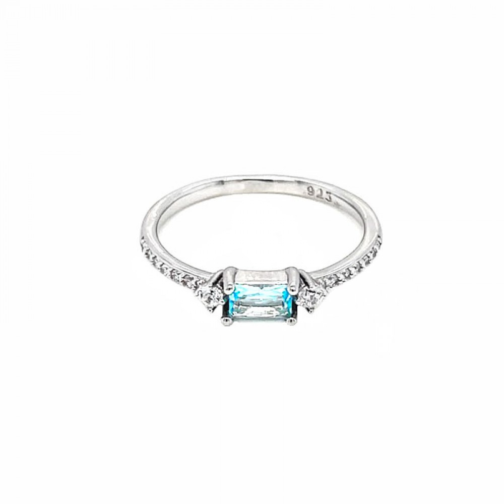 Διακριτικό δαχτυλίδι με πέτρα aqua-marine στο κέντρο και λευκές πέτρες ζιργκόν στο πλάι