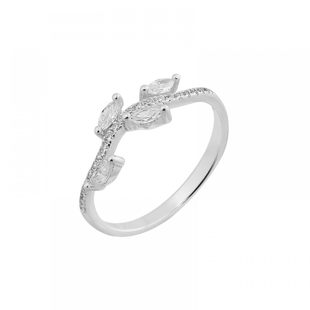 Ασημένιο δαχτυλίδι με σχήμα κλαδιού με φύλλα , διακοσμημένο με πέτρες ζιργκόν