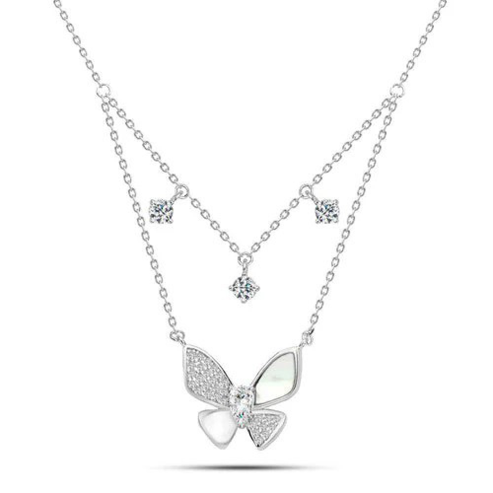 Κολιέ με διπλή αλυσίδα , στην κάτω αλυσίδα έχει μια πεταλούδα και στην πάνω αλυσίδα κρέμονται τρεις πέτρες ζιργκόν