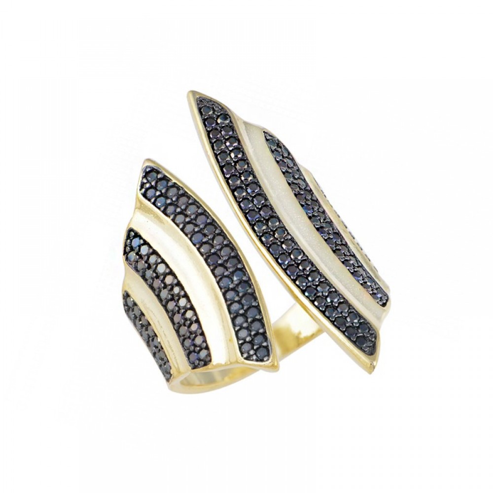 Εντυπωσιακό δαχτυλίδι από ασήμι επιχρυσωμένο με μαύρες πέτρες ζιργκόν