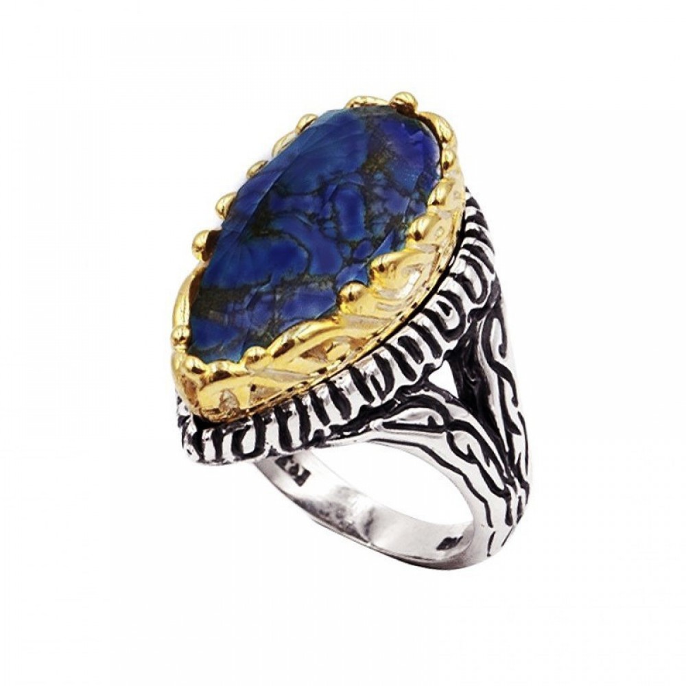 Ασημένιο χειροποίητο δαχτυλίδι με επίχρυσες λεπτομέρειες και πέτρα λάπις
