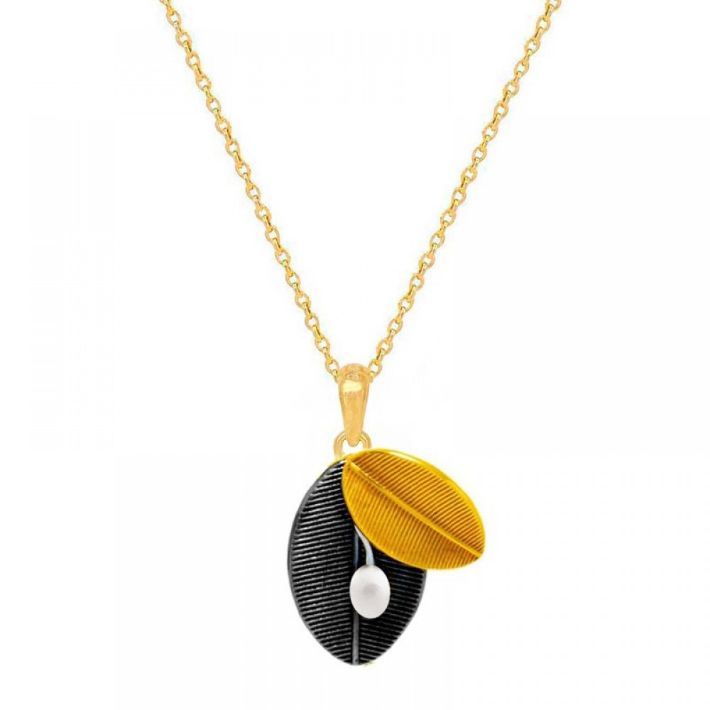 Ασημένιο κολιέ με φύλλα ελιάς και μαργαριτάρι , χειροποίητο με επιχρύσωση 24Κ