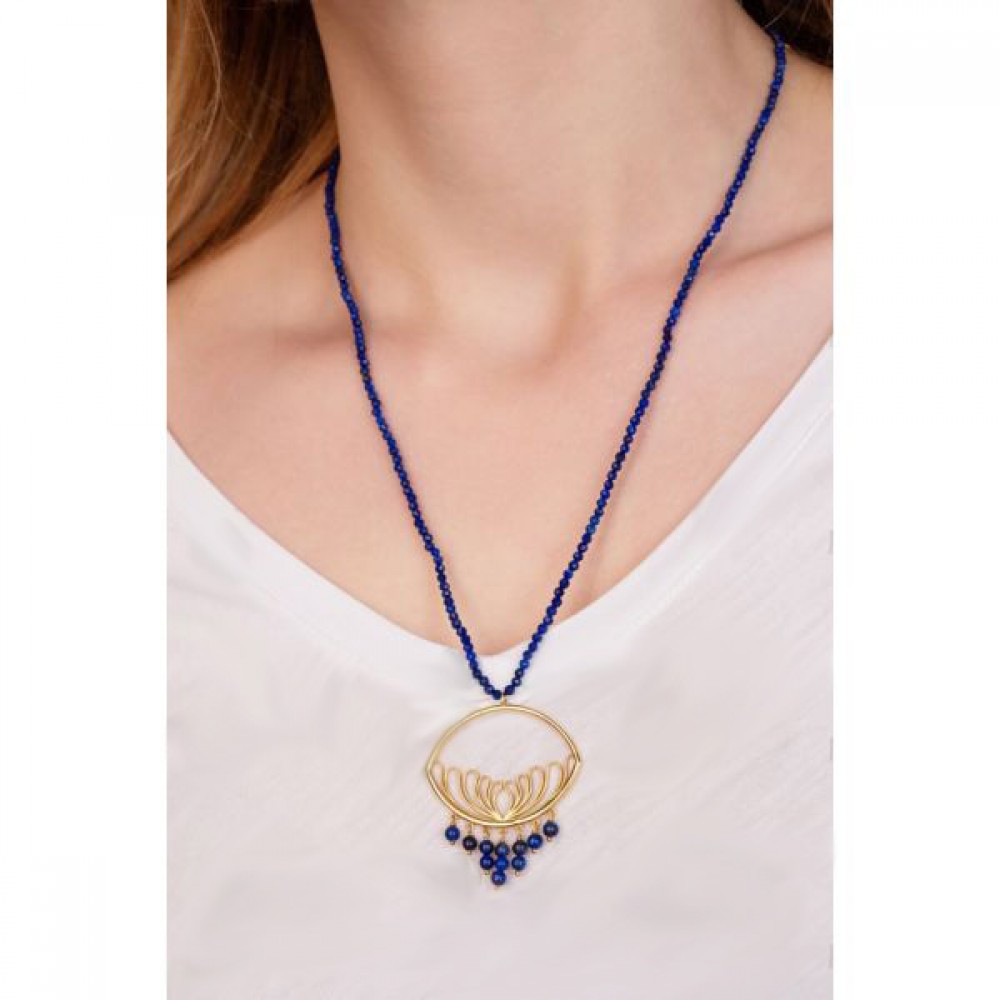Ασημένιο και επιχρυσωμένο μακρύ κολιέ με ημιπολύτιμες πέτρες λάπις λάζουλι