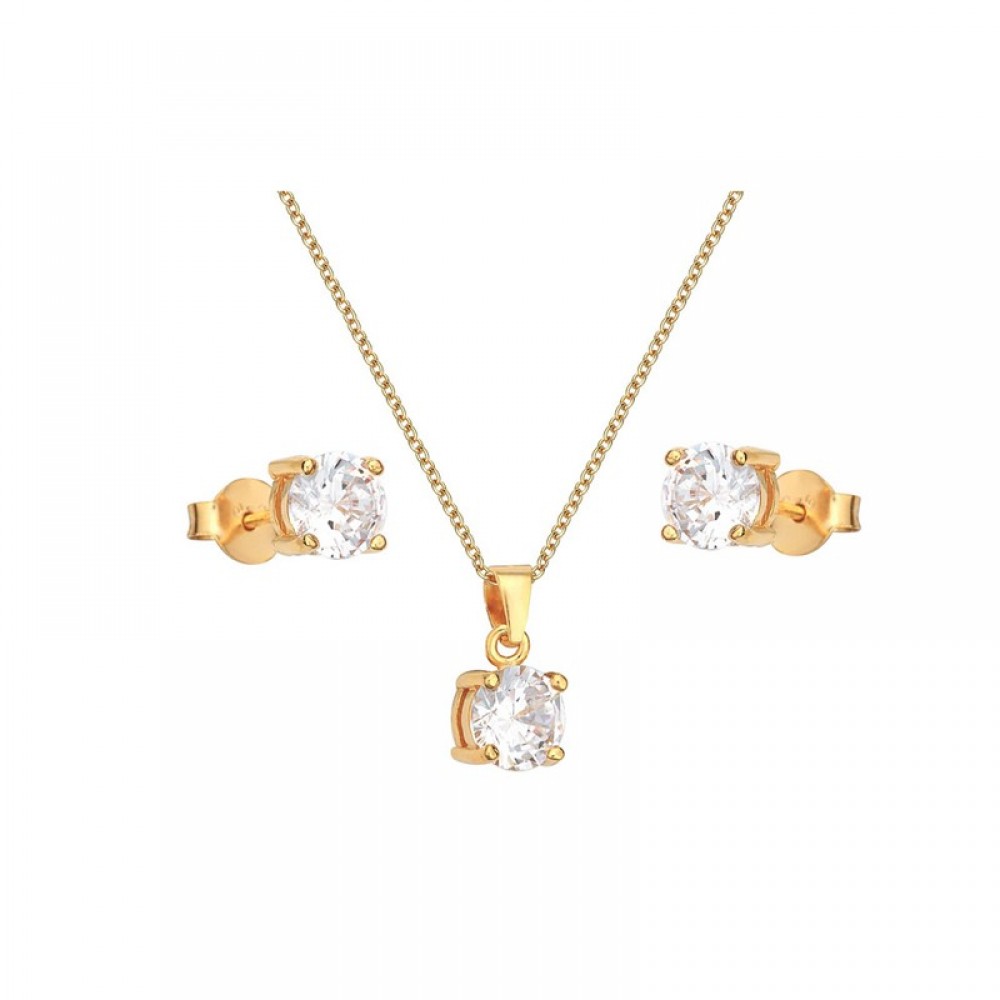 Ασημένιο επίχρυσο μονόπετρο σετ (κολιέ - σκουλαρίκια) με λευκές πέτρες ζιργκόν
