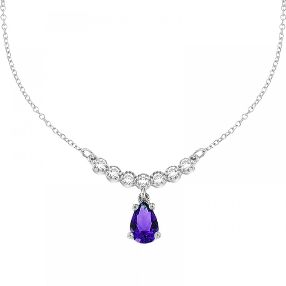 Κομψό κολιέ με αμέθυστο πέτρα σε σχήμα σταγόνας και μικρές λευκές πέτρες ζιργκόν στη βάση της αλυσίδας
