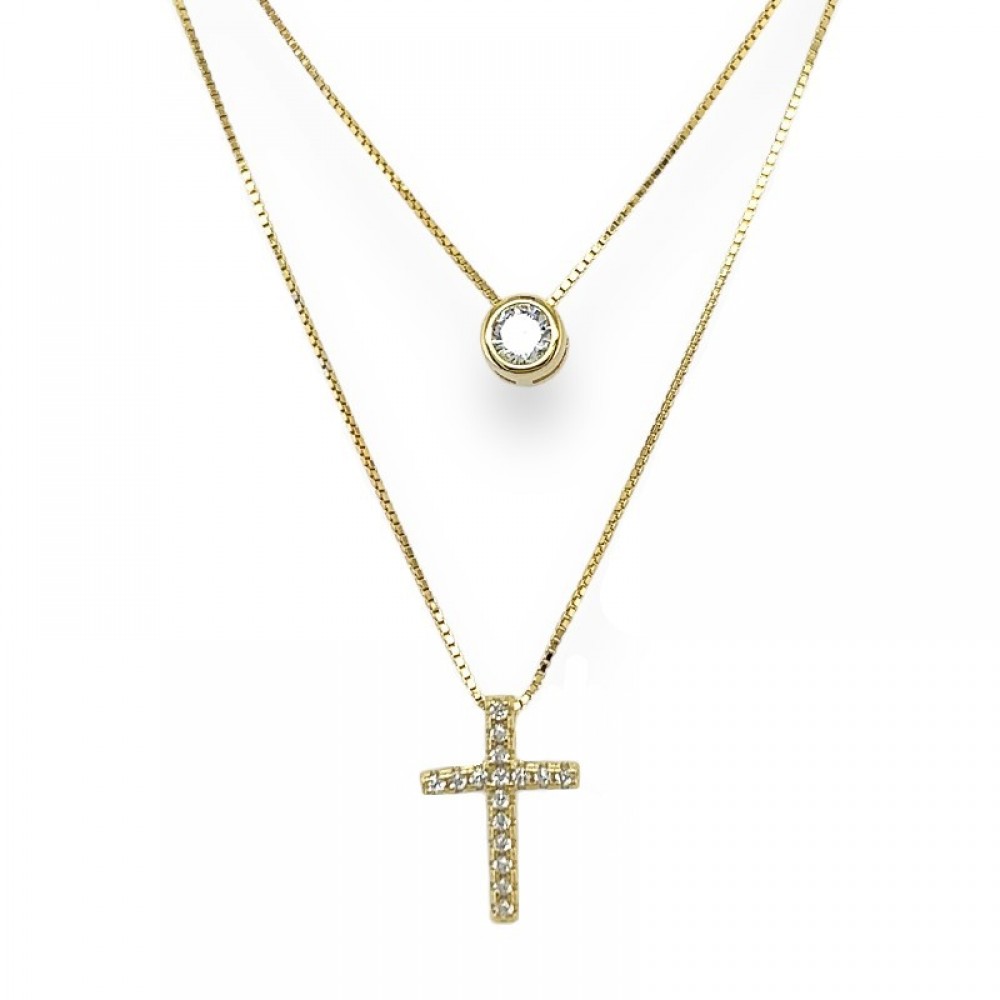Ασημένιο διπλό κολιέ με σταυρό και πέτρα ζιργκόν επιχρυσωμένο