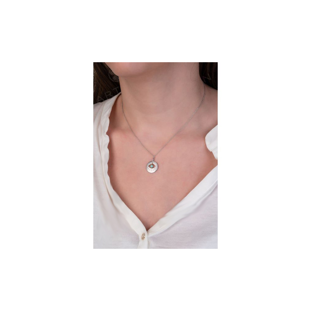 Κολιέ με στρόγγυλο μάτι με μικρή πέτρα τιρκουάζ στο κέντρο , κατασκευασμένο από ασήμι 925° επιπλατινωμένο .