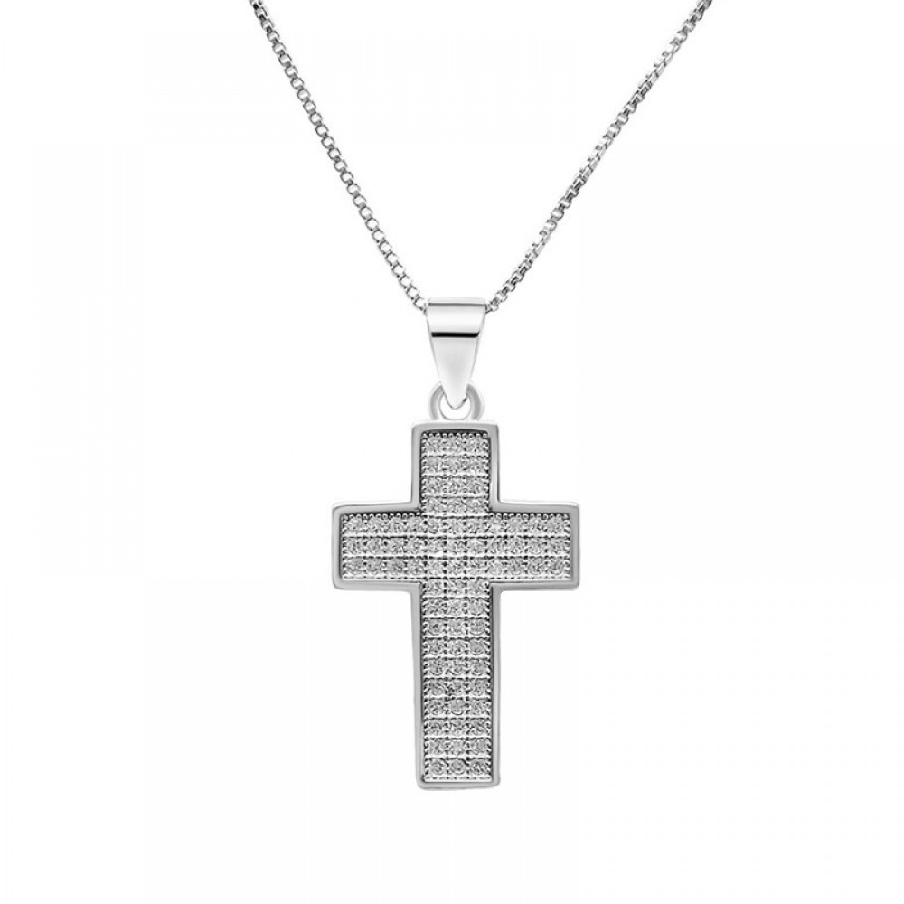 Ασημένια αλυσίδα με σταυρό διακοσμημένος με τρεις σειρές πέτρες ζιργκόν