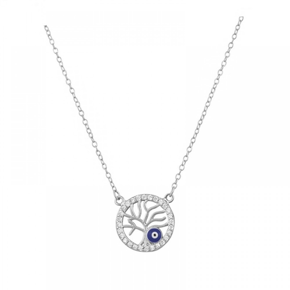 Ασημένιο επιπλατινωμένο κολιέ με το δέντρο της ζωής και ματάκι