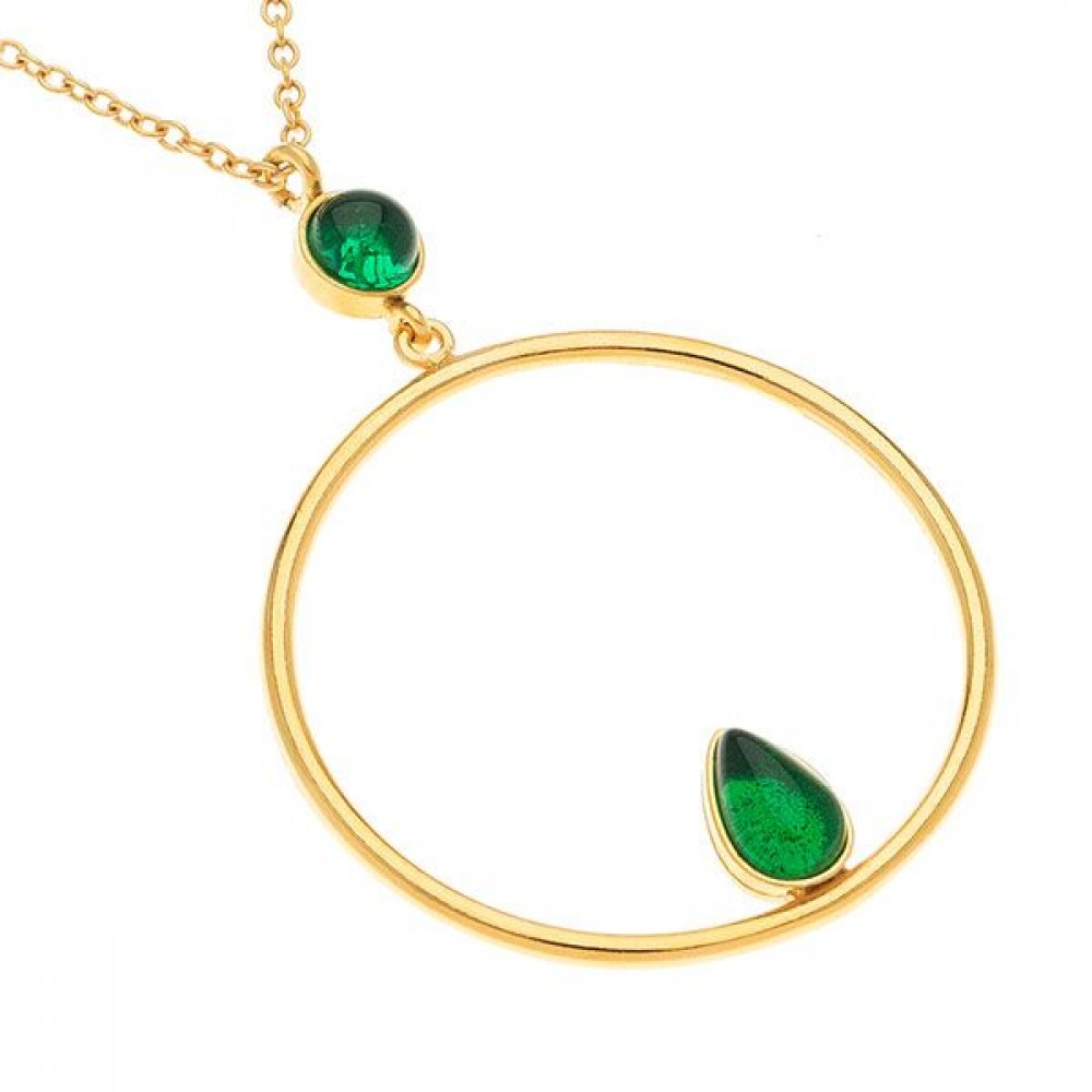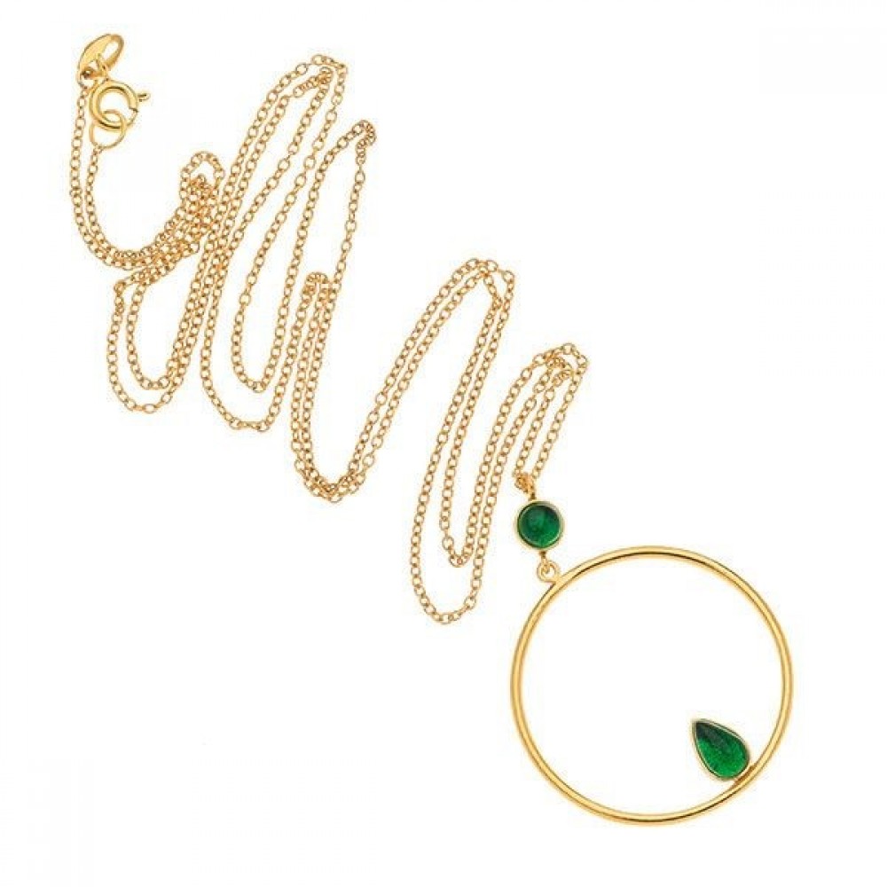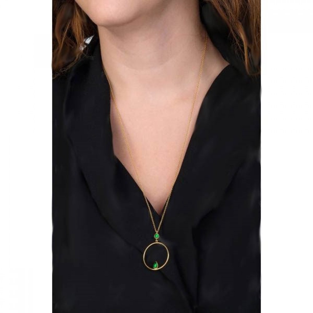 Ασημένιο και επιχρυσωμένο μακρύ κολιέ με πέτρες σμαραγδί.