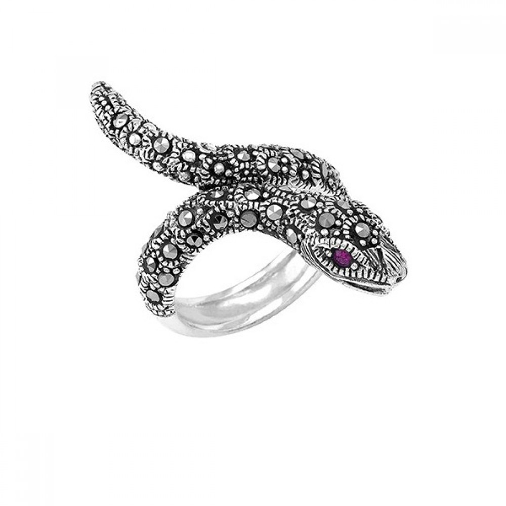 Ασημένιο δαχτυλίδι με σχήμα φιδιού και πέτρες μαρκασίτη