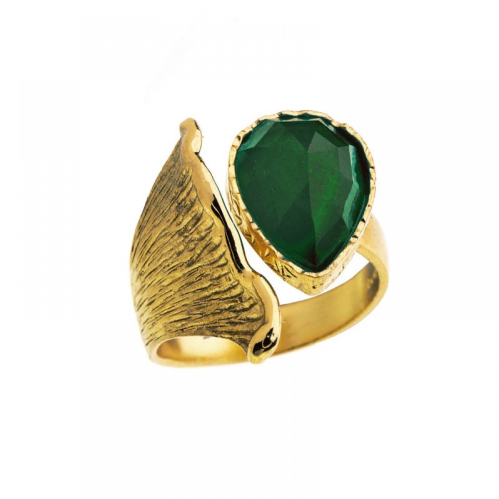 Ασημένιο και επιχρυσωμένο χειροποίητο δαχτυλίδι με πράσινη πέτρα
