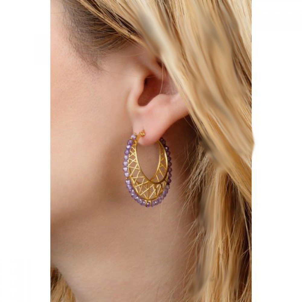 Ασημένιοι και επιχρυσωμένοι κρίκοι μεσαίου μεγέθους με ακτινωτό σχήμα και πέτρες αμέθυστος