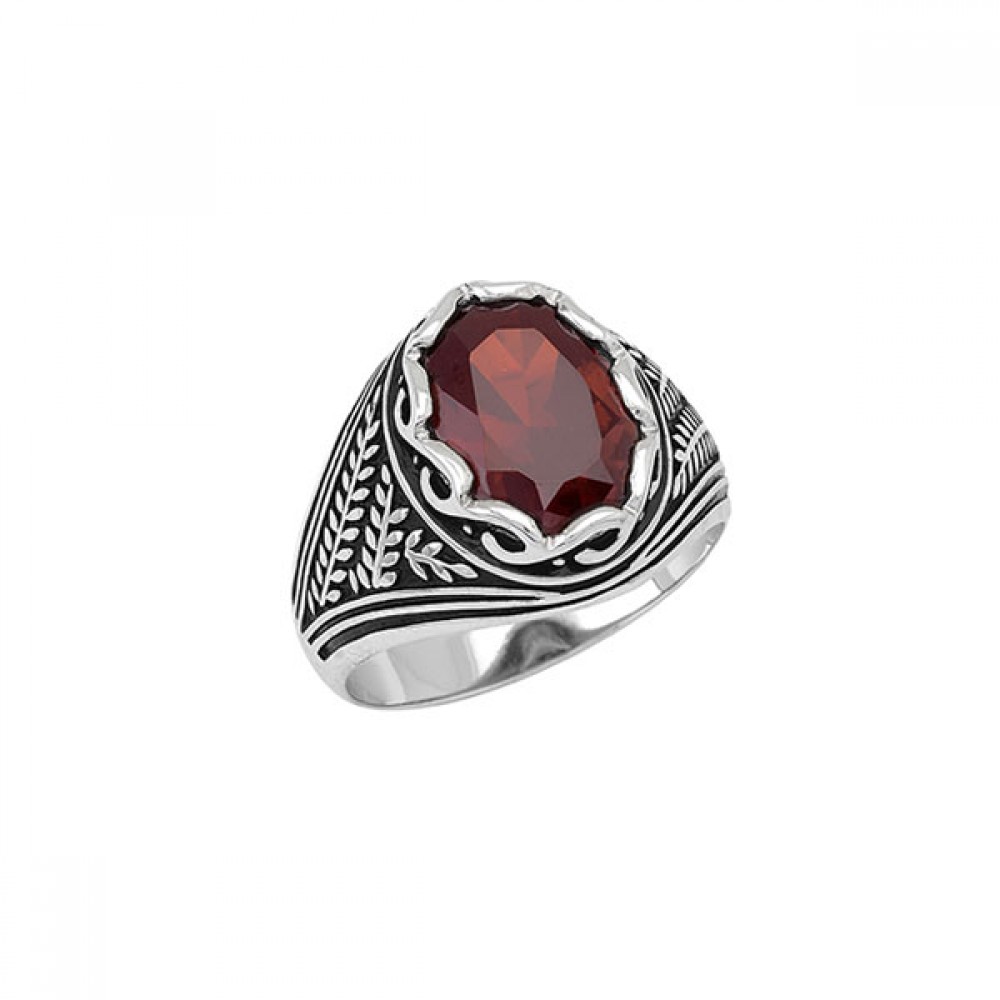 Ασημένιο ανδρικό δαχτυλίδι σκαλιστό με κόκκινη πέτρα