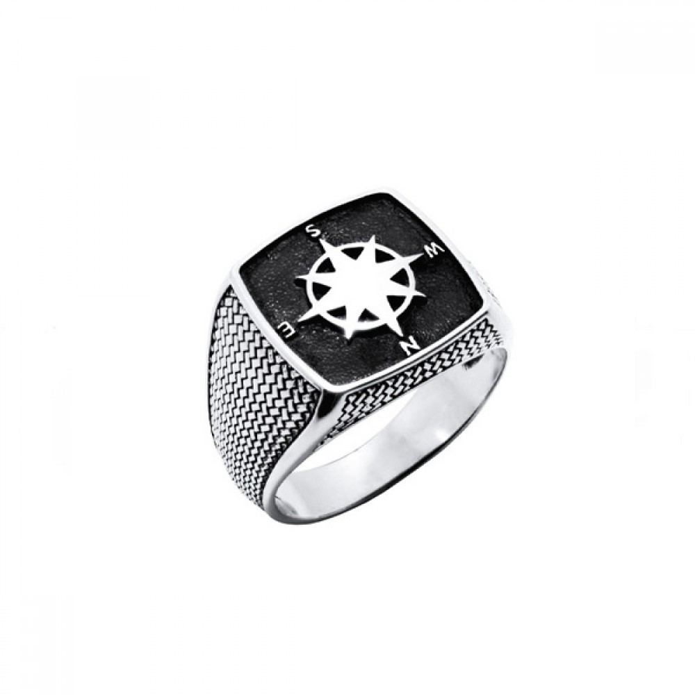 Ασημένιο ανδρικό δαχτυλίδι με ανάγλυφο σκάλισμα πυξίδα