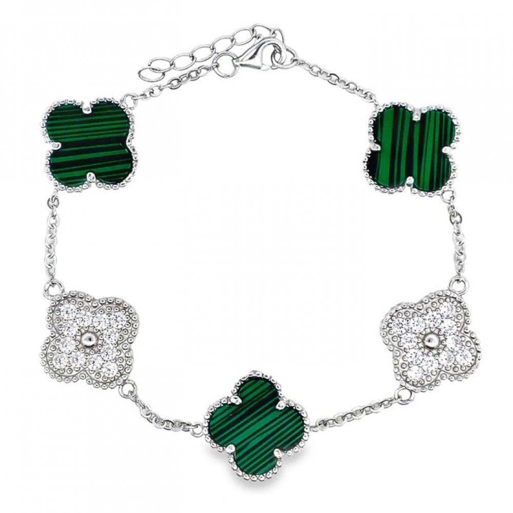 Ασημένιο βραχιόλι με πέντε στοιχεία με πέτρες μαλαχίτη και ζιργκόν