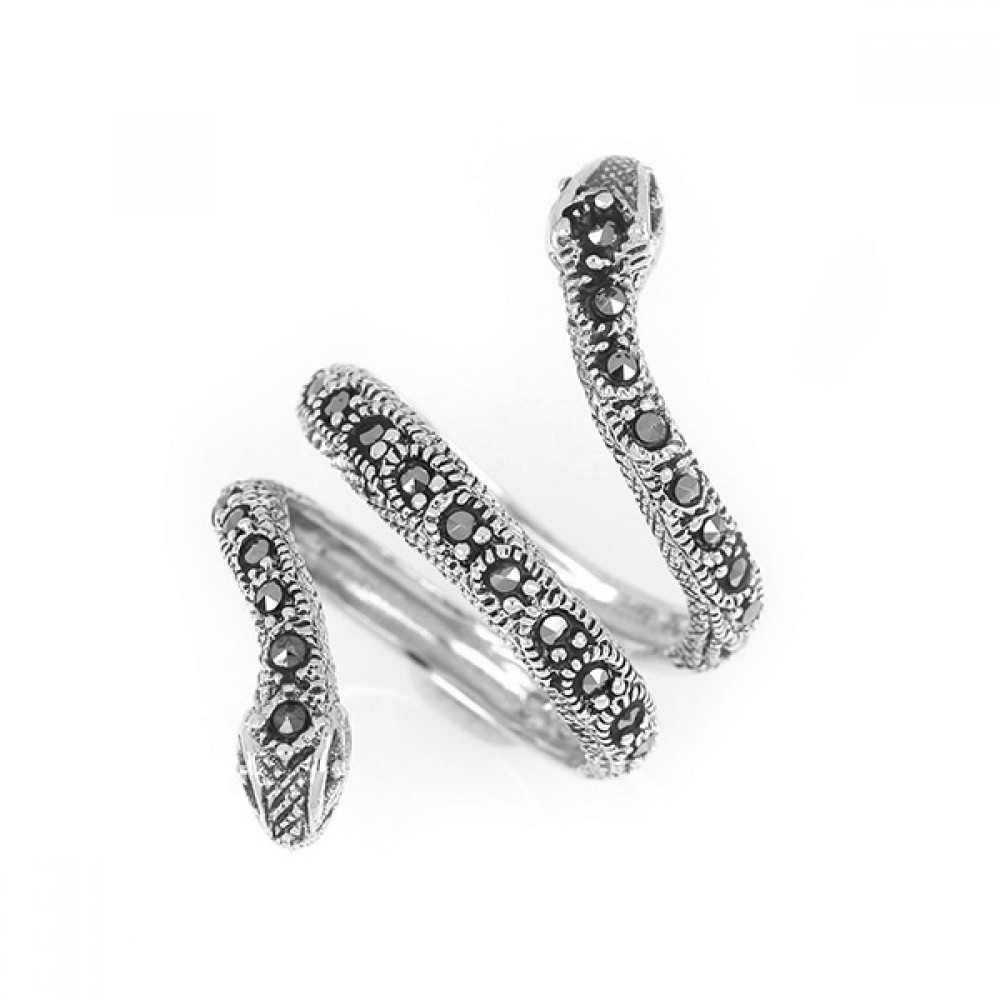 Ασημένιο δαχτυλίδι φίδι με δύο κεφάλια και πέτρες μαρκασίτη