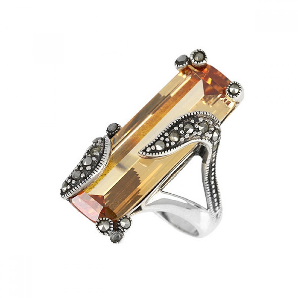 Ασημένιο δαχτυλίδι με ορθογώνια πέτρα σιτρίν και μικρές πέτρες μαρκασίτη
