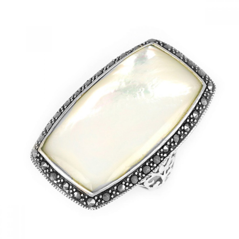 Ασημένιο εντυπωσιακό δαχτυλίδι με πέτρες μαρκασίτη και φίλντισι
