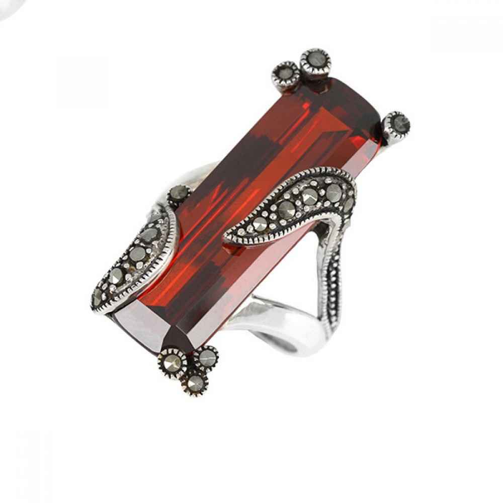 Ασημένιο δαχτυλίδι με ορθογώνια πέτρα γρανάδα και μικρές πέτρες μαρκασίτη