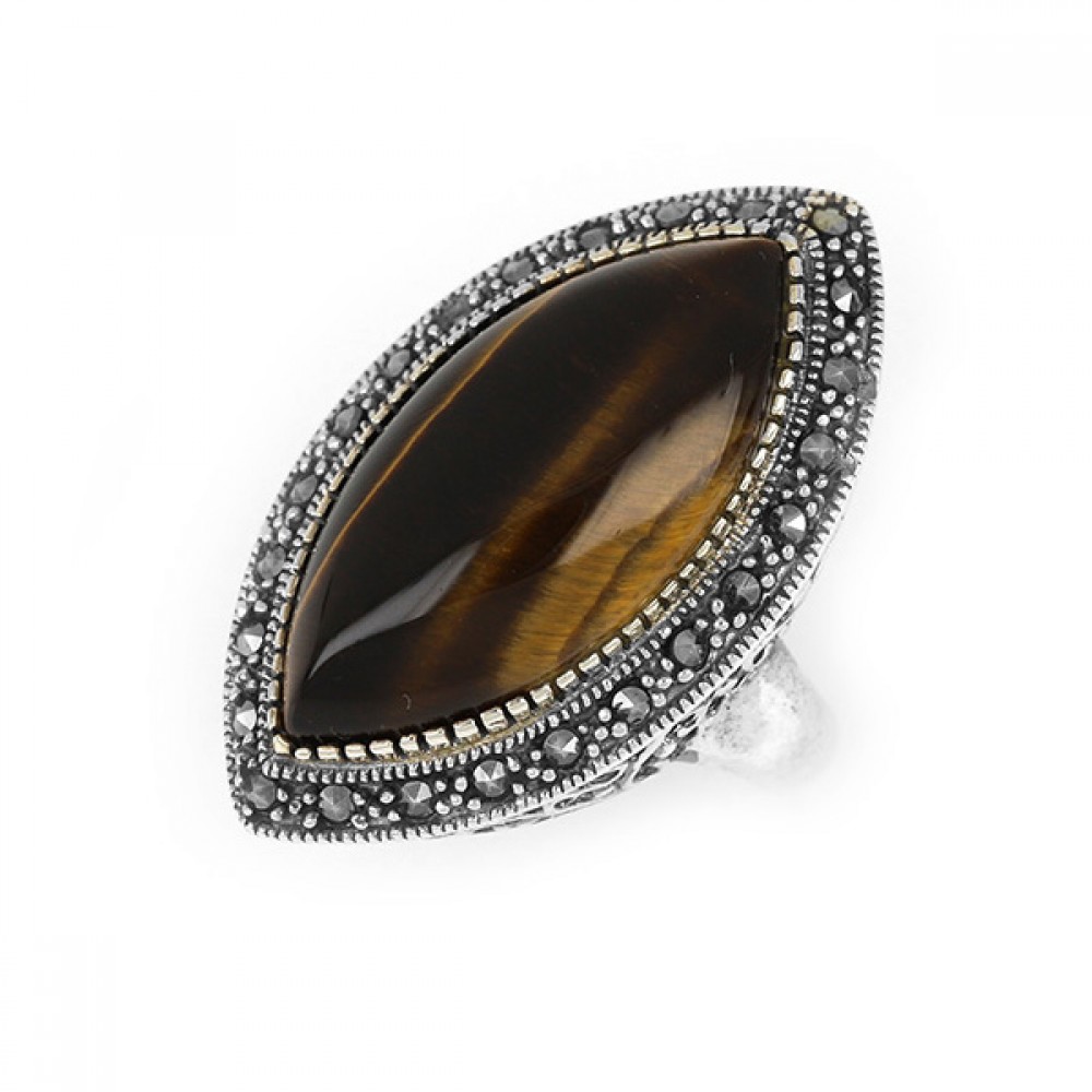 Ασημένιο δαχτυλίδι με μεγάλη πέτρα "Μάτι της τίγρης" και μικρές πέτρες μαρκασίτη