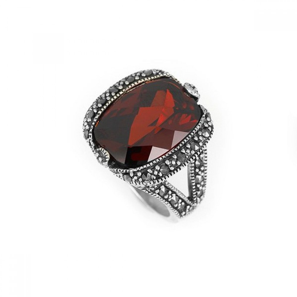 Ασημένιο δαχτυλίδι με πέτρες ζιργκόν-γρανάδα και μαρκασίτης
