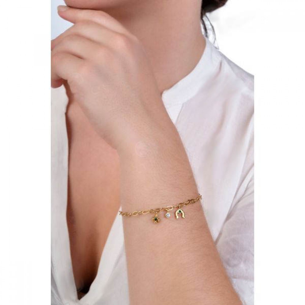 Ασημένιο βραχιόλι με κρεμαστά στοιχεία (σταυρό , πέταλο και μικρή πέτρα ζιργκόν σε λευκό χρώμα).