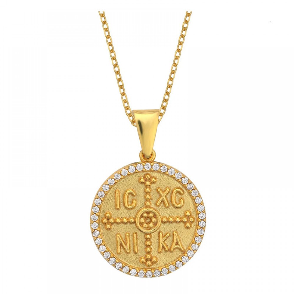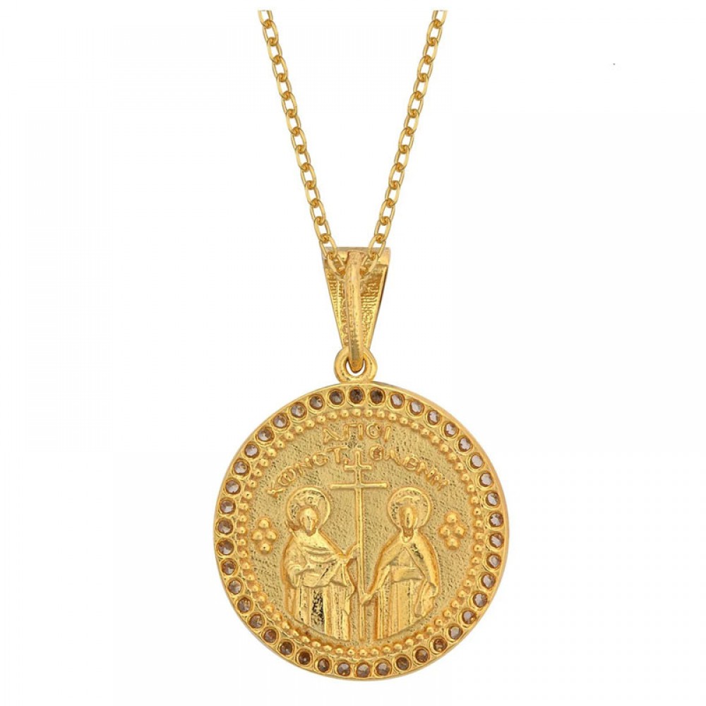 Ασημένιο και επιχρυσωμένο μεγάλο φυλαχτό - Κωνσταντινάτο διπλής όψεως με πέτρες ζιργκόν