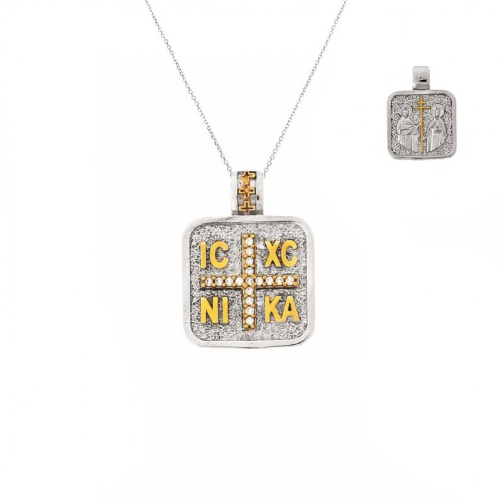Ασημένιο με επίχρυσες λεπτομέρειες φυλαχτό - Κωνσταντινάτο διπλής όψεως με πέτρες ζιργκόν