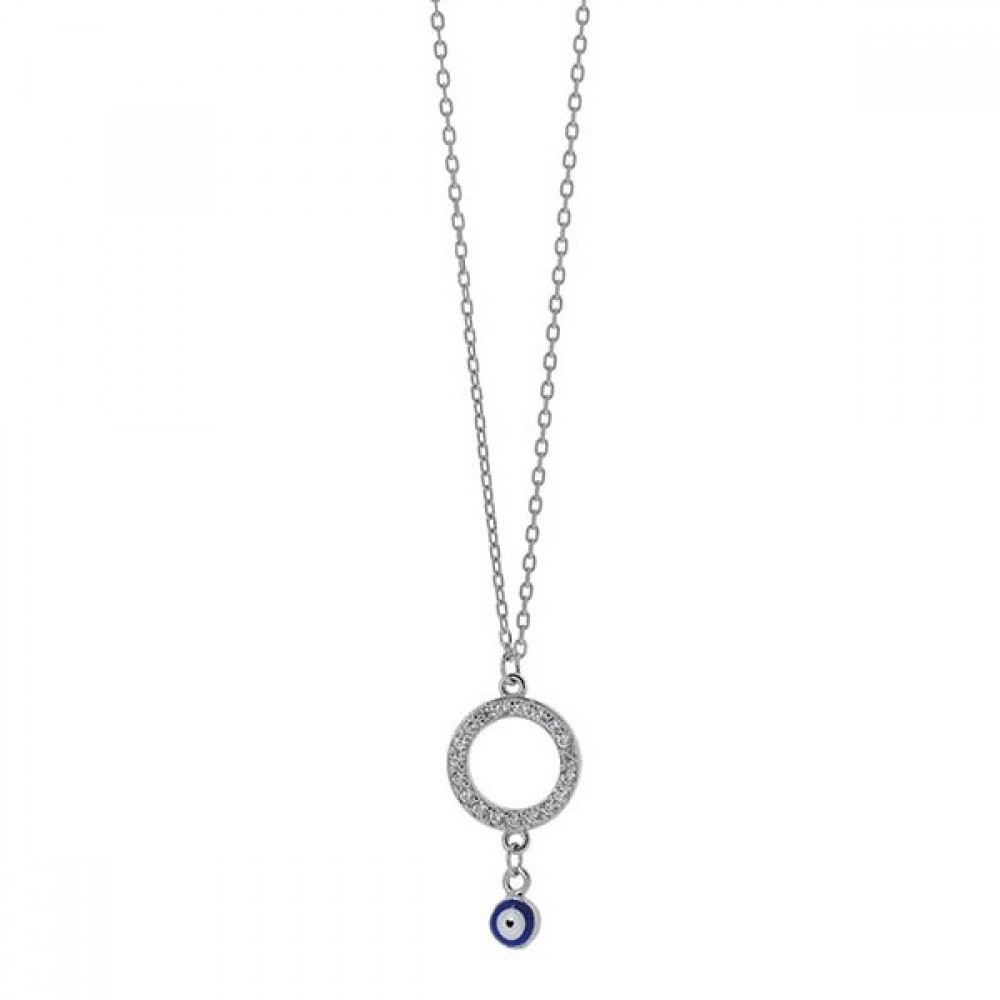 Κολιέ με κύκλο και μικρό κρεμαστό μάτι , κατασκευασμένο από ασήμι 925° επιπλατινωμένο . Ο κύκλος έχει πέτρες ζιργκόν λευκές.