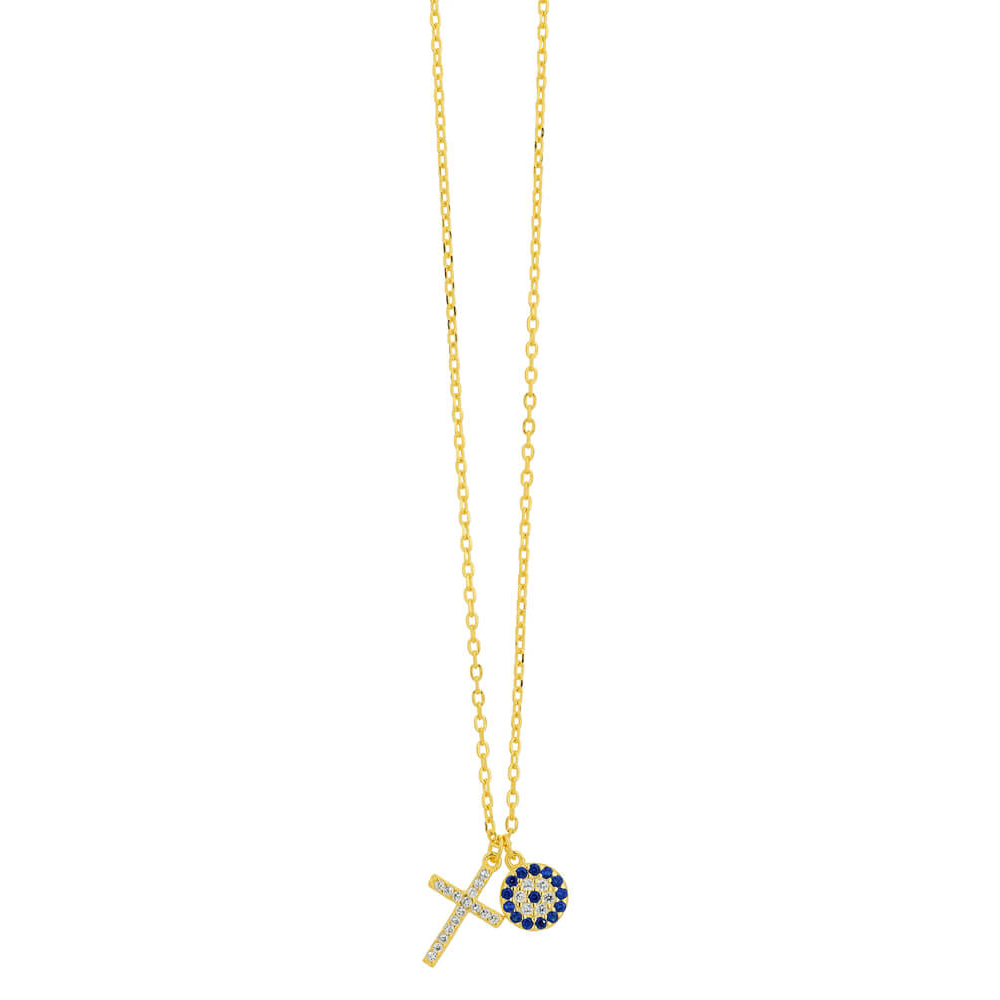 Κολιέ με κρεμαστό μάτι και σταυρό , κατασκευασμένο από ασήμι 925° επιχρυσωμένο. Το μάτι έχει πέτρες ζιργκόν σε λευκό και μπλε χρώμα και ο σταυρός έχει πέτρες ζιργκόν σε λευκό χρώμα.
