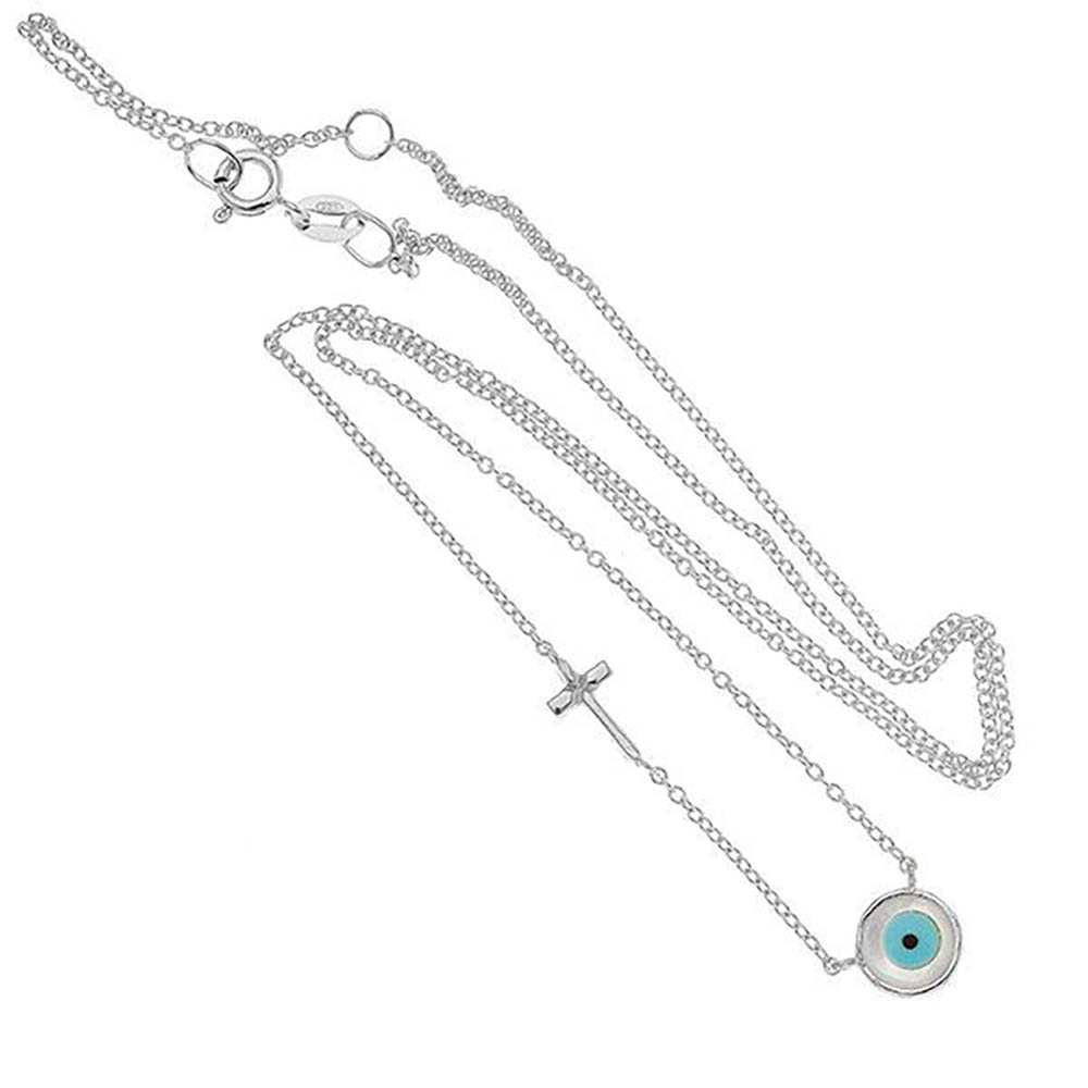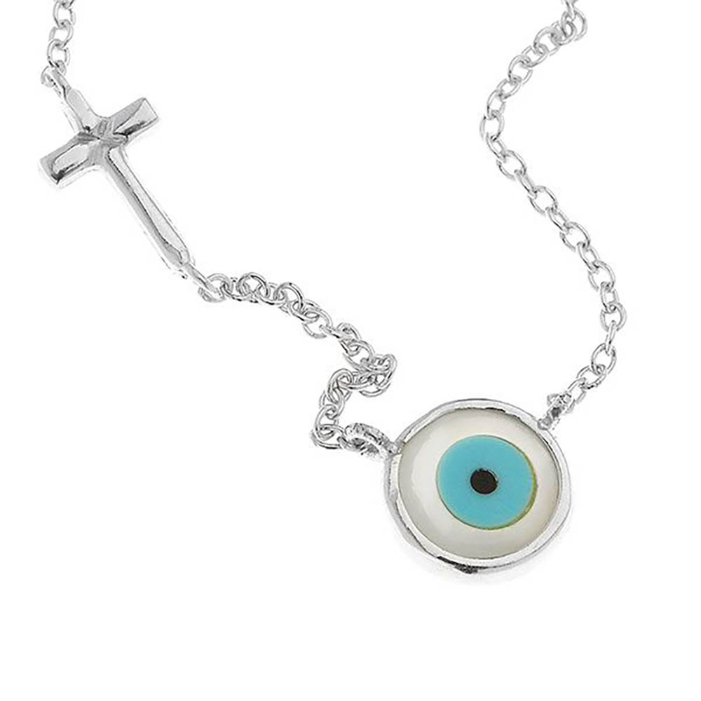 Κολιέ με μάτι από φίλντισι και σταυρό στο πλάι , κατασκευασμένο από ασήμι 925° επιπλατινωμένο.