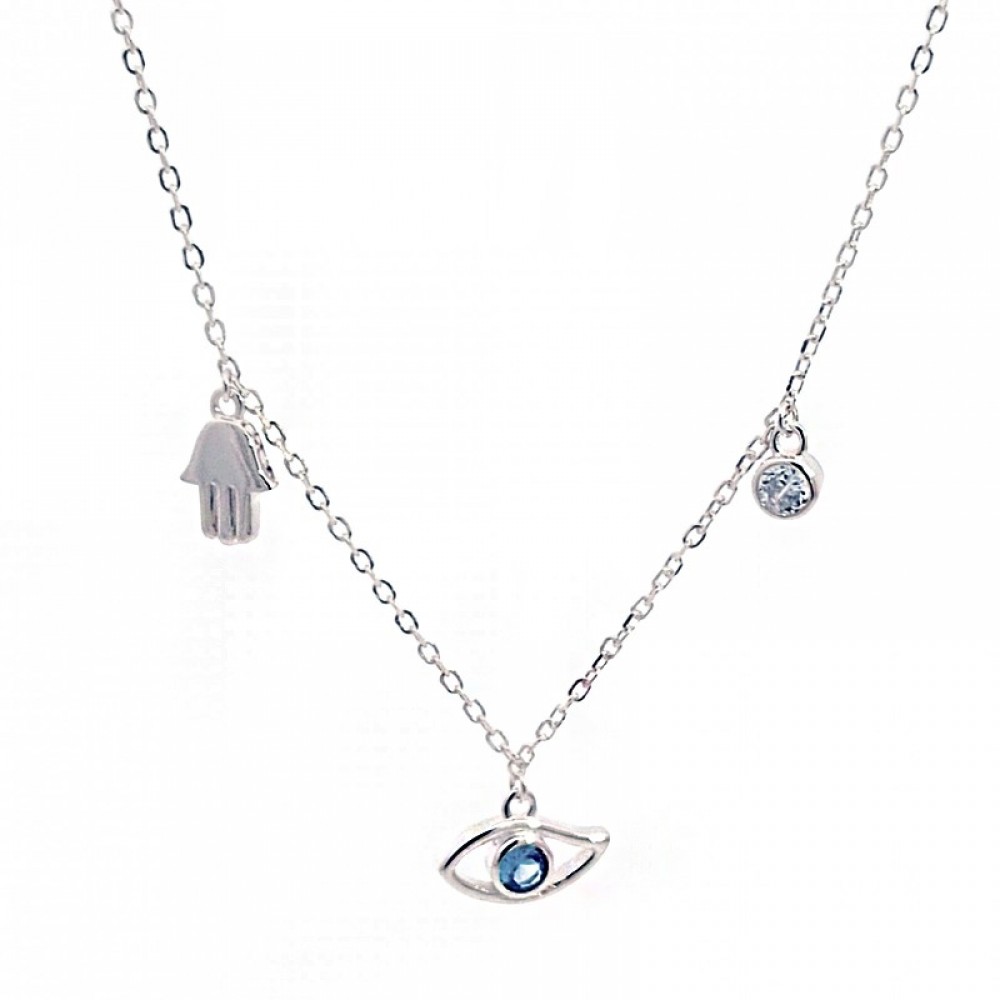Κολιέ με κρεμαστά στοιχεία : μάτι , λευκή πέτρα ζιργκόν και χέρι της Φατιμά
