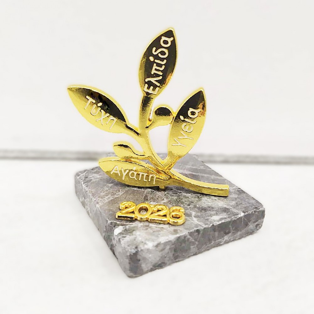 Επιτραπέζιο γούρι με μεταλλικό κλαδί ελιάς σε κίτρινο χρυσό με ευχές (τύχη , ελπίδα , αγάπη , υγεία ) πάνω σε μαύρη πέτρα