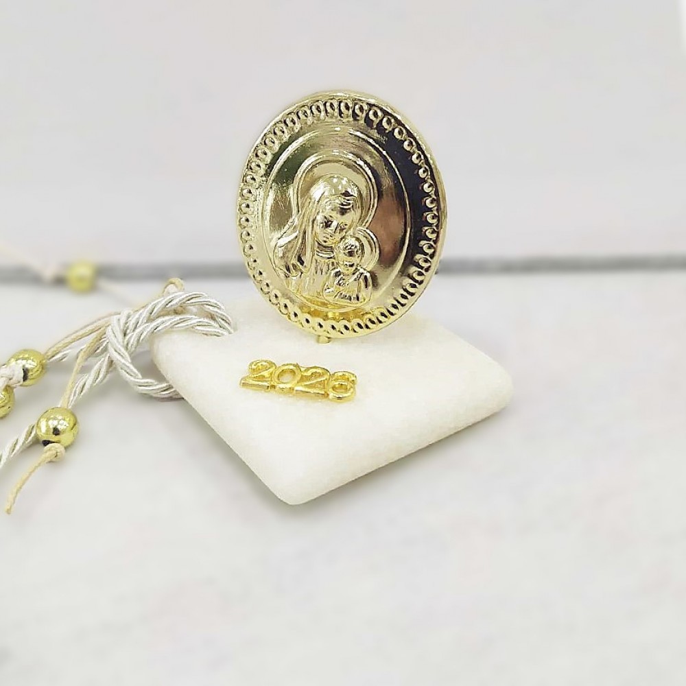 Επιτραπέζιο γούρι με μεταλλικό Παναγία με Χριστό σε κίτρινο χρυσό πάνω σε λευκή πέτρα