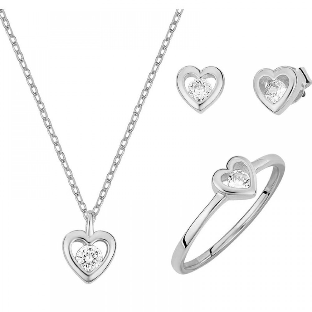 Ασημένιο διακριτικό σετ με σχήμα καρδιά (κολιέ - δαχτυλίδι - σκουλαρίκια)
